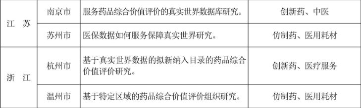 近期,国家医保局围绕落实《支持创新药高质量发展的若干措施》,聚焦真实世界数据支持药品医保综合价值评价,开展试点工作。医保综合价值评价试点先行地区名单及任务分工中,入选的江苏南京市、苏州市,浙江杭州市、温州市研究方向、评价类别如下: