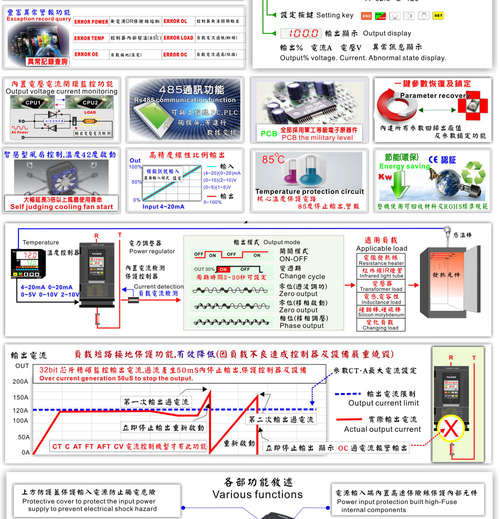 8種輸入模式選擇 輸出模式:零位.相位.限流.限壓.恒流.恒壓.周期 RS485通訊功能